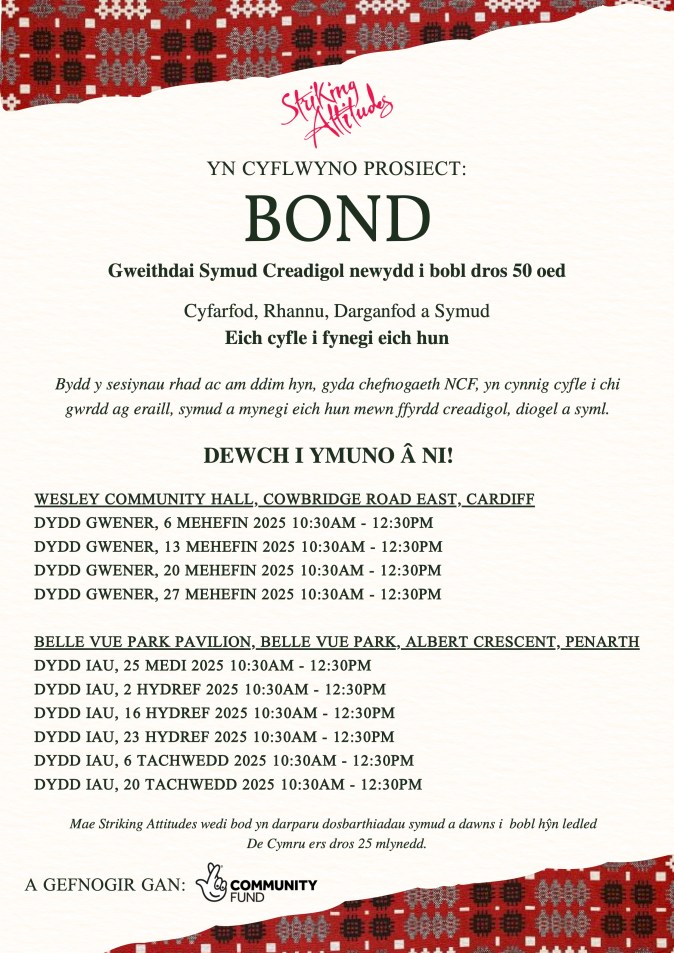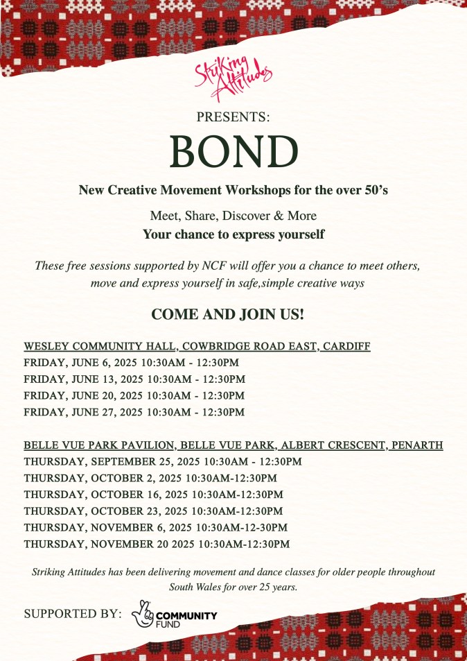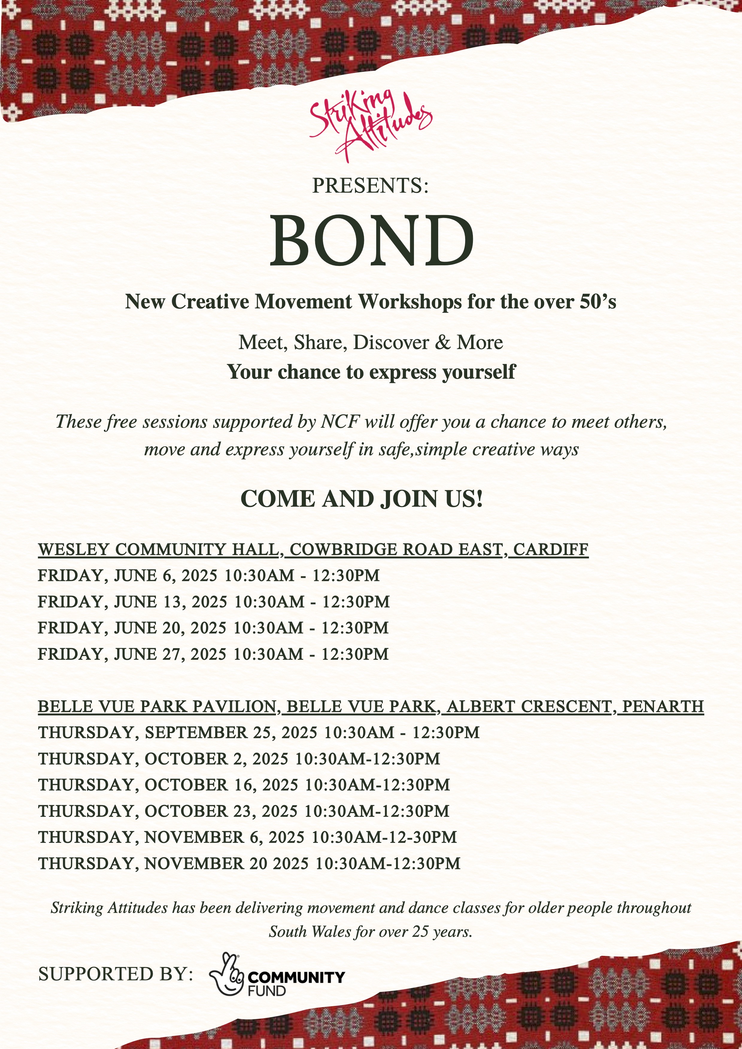 Sincere thanks go to the National Lottery players and the National Lottery Community Fund for believing in the power of creativity to transform lives and communities, enabling these sessions to be offered in a range of Welsh communities free of charge. BOND sessions have already been successfully enjoyed in Cardiff and Pontypridd. The next BOND sessions take place in the Belle Vue Park Pavilion, Penarth, Vale of Glamorgan during September, October and November 2025 (see adjoining flyer for dates and times).