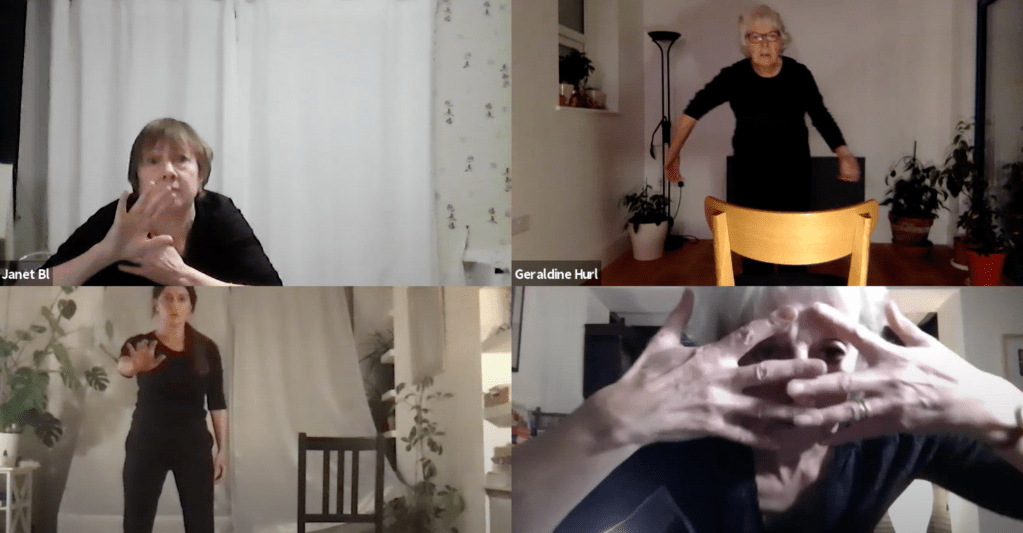 ‘Summer’ – the strangeness and uncertainty of Summer 2021. Work in development made from material created in Striking Attitudes’ summer creative Zoom sessions with Caroline Lamb, Janet Fieldsend and Aleksandra Nikolajev Jones, filmed by David Heke.